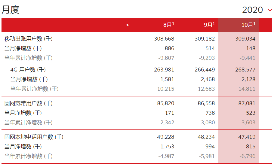 在移动业务方面,中国联通移动出账用户10月净减14.8万户,累计达3.09亿户,移动出账用户本年累计净减944.1万户。其中4G用户本月净增212.8万户,累计达到2.69亿户,4G用户本年累计净增1481.1万户。