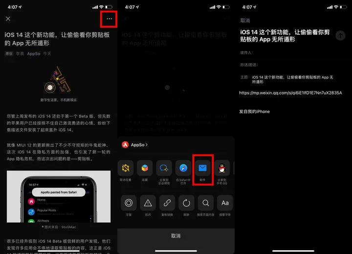 在微信中,打开公众号文章,或是打开其他网页,点击右上角「…」,可以看到分享操作中多了「邮件」选项。