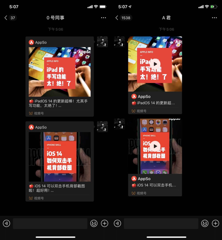 当分享视频号中的视频给微信好友时,可以看到卡片与之前有所不同:封面外的边框消失,标题显示长度缩短,发布者信息被移动到了标题上方。