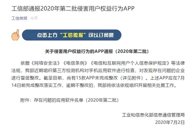 近日,工信部通报2020年第二批侵害用户权益行为APP,以下为通报全文: