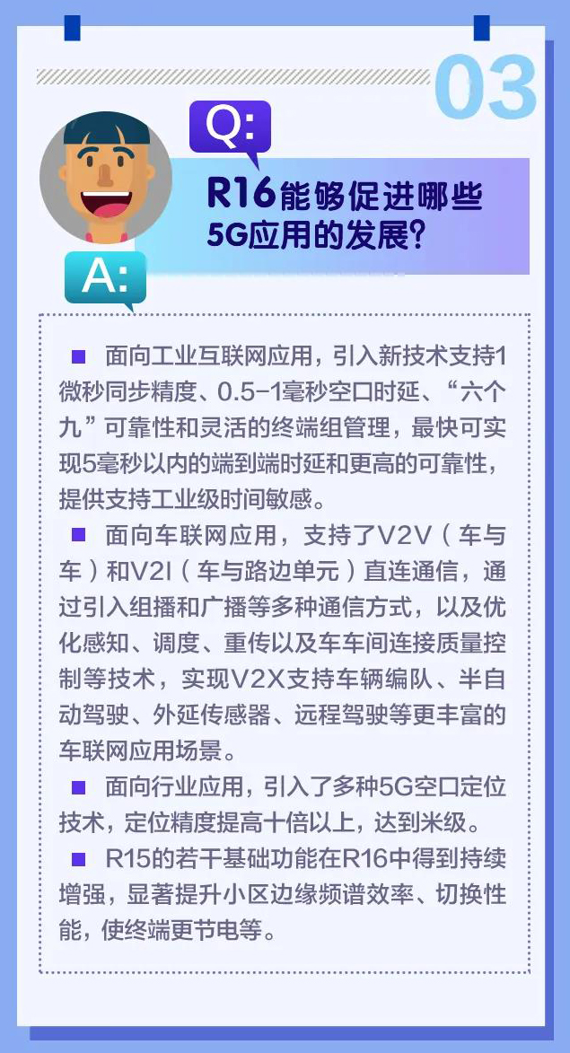 具体而言,R16标准,不仅能增强5G的功能,让5G进一步走入各行各业并催生新的数字生态产业,还更多兼顾了成本、效率、效能等因素,使通信基础投资发挥更大的效益,进一步助力社会经济的数字转型。例如,面向工业互联网应用,引入新技术支持1微秒同步精度、0.5-1毫秒空口时延、“六个九”可靠性和灵活的终端组管理,最快可实现5毫秒以内的端到端时延和更高的可靠性,提供支持工业级时间敏感。面向车联网应用,支持了V2V(车与车)和V2I(车与路边单元)直连通信,通过引入组播和广播等多种通信方式,以及优化感知、调度、重传,以及车车间连接质量控制等技术,实现V2X支持车辆编队、半自动驾驶、外延传感器、远程驾驶等更丰富的车联网应用场景。面向行业应用,引入了多种5G空口定位技术,定位精度提高十倍以上,达到米级。