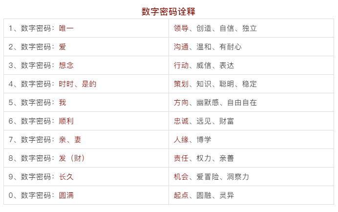 0——代表圆满、完美、无尽;1——代表唯一、你 、 起点;2——代表爱、两人世界;3——代表想念、生命、生活;4——代表是的、时时;5——代表“我,无,也是勿”,也可以理解为不分你我;6——代表顺利、溜达;7——代表请、亲、起、气;8——代表发、拜拜、不;9——代表久、久、求。