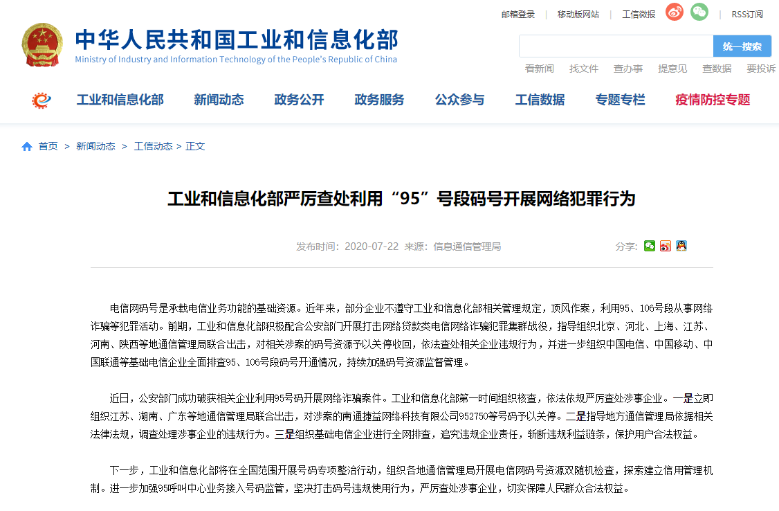 据工业部网站消息,近日,公安部门成功破获相关企业利用95号码开展网络诈骗案件。工信部第一时间组织核查,依法依规严厉查处涉事企业。