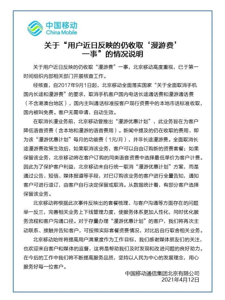 北京移动称,在取消长途漫游费用前,北京移动曾推出“漫游优惠计划”,此业务旨为客户降低语音资费(含本地和漫游的语音费用)。新闻中描述的仍在收取的费用,即为该“漫游优惠计划”每月的功能费(1元/月),并非长途漫游费……北京移动将根据此次事件反映出的套餐梳理、与客户沟通等方面存在的问题举一反三,完善相关业务上下线管理力度,使服务体系更加人性化,同时优化服务流程和客户沟通口径。