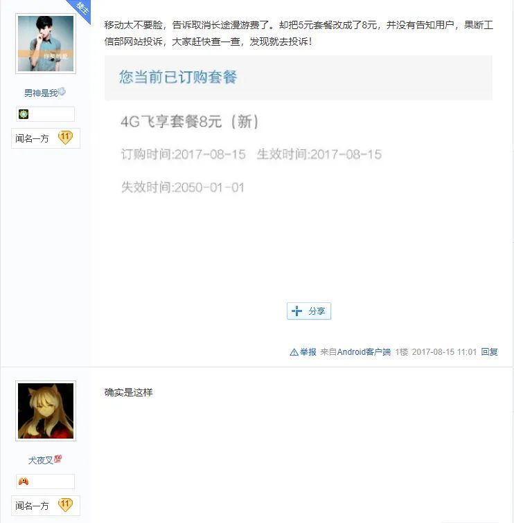 大白财经观察梳理发现,移动因“套餐”问题被投诉已屡见不鲜。早在2017年8月,就有贴吧用户发文称,在被中国移动告知取消长途漫游费后,自己的月租套餐被擅自从5元档改为了8元档,且没有告知用户。