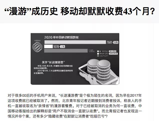 此前有媒体报道称一位用户被收取了43个月漫游费,对此中国移动客服称在取消长途漫游业务前,北京移动曾推出“漫游优惠计划”。