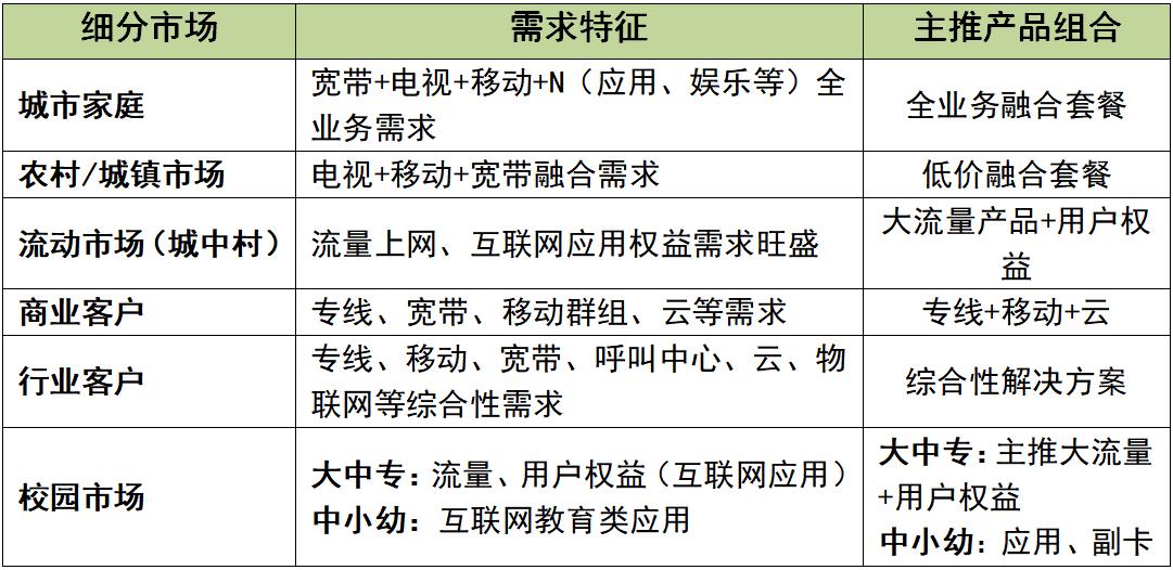 目前,运营商主要细分市场包括:城市家庭、农村/城镇市场、流动市场(城中村)、商业客户、行业客户、校园市场六大类。