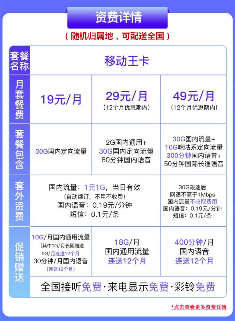 3、49元王卡,标准资费99元/月全球通,国内流量30G达量限速(2/3/4G网络)和300分钟国内主叫国内通话,50分钟国内主叫国际长途语音通话(仅指美国、德国等九个方向),赠送10G咪咕系定向流量,免费赠送来电显示,在国内接听电话免费;产品有效期一年,到期后以公告或短信通知为准,如无通知自动延期一年。超过套餐包含通话时长后:直接拨打国内电话0.19元/分钟。国内流量超过30G后,国内流量网速限速(10G咪咕定向流量不在限速范围),限速后网速不高于1Mbps,国内流量不收取费用;当月全部流量使用达到200GB后,限速至128Kbps。短信费:发送国内短信0.1元/条;接收免费(不含梦网信息)。本套餐内流量不可结转。
