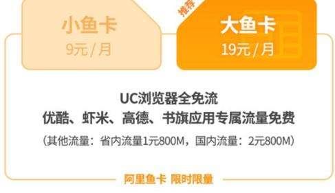 阿里小鱼卡:资费每月9元,享受阿里系特定应用免流,日租宝套餐为1元800M;