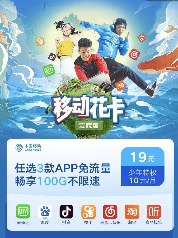 花卡宝藏版用户除享受中国移动精品APP免流外,每月可以选择3个APP定向免流,免流APP每月还可以自由更换,100G内不限速。