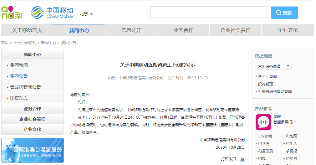 公示称,为满足客户的通信消费需求, 中国移动近期将对线上号卡资费产品进行调整,现有移动花卡宝藏版(宝藏卡)、芝麻卡将于10月31日24:00下线停售。