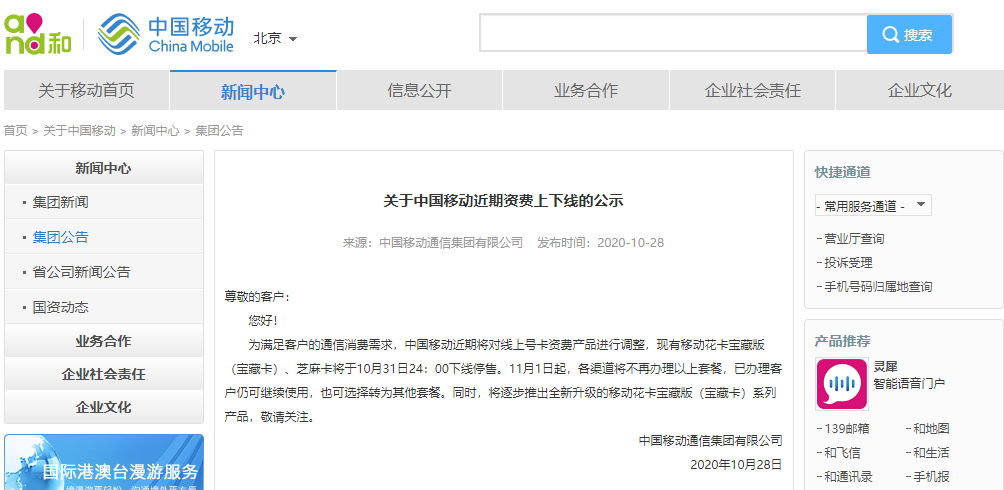 公示称,为满足客户的通信消费需求,中国移动近期将对线上号卡资费产品进行调整,现有移动花卡宝藏版(宝藏卡)、芝麻卡将于10月31日24:00下线停售。